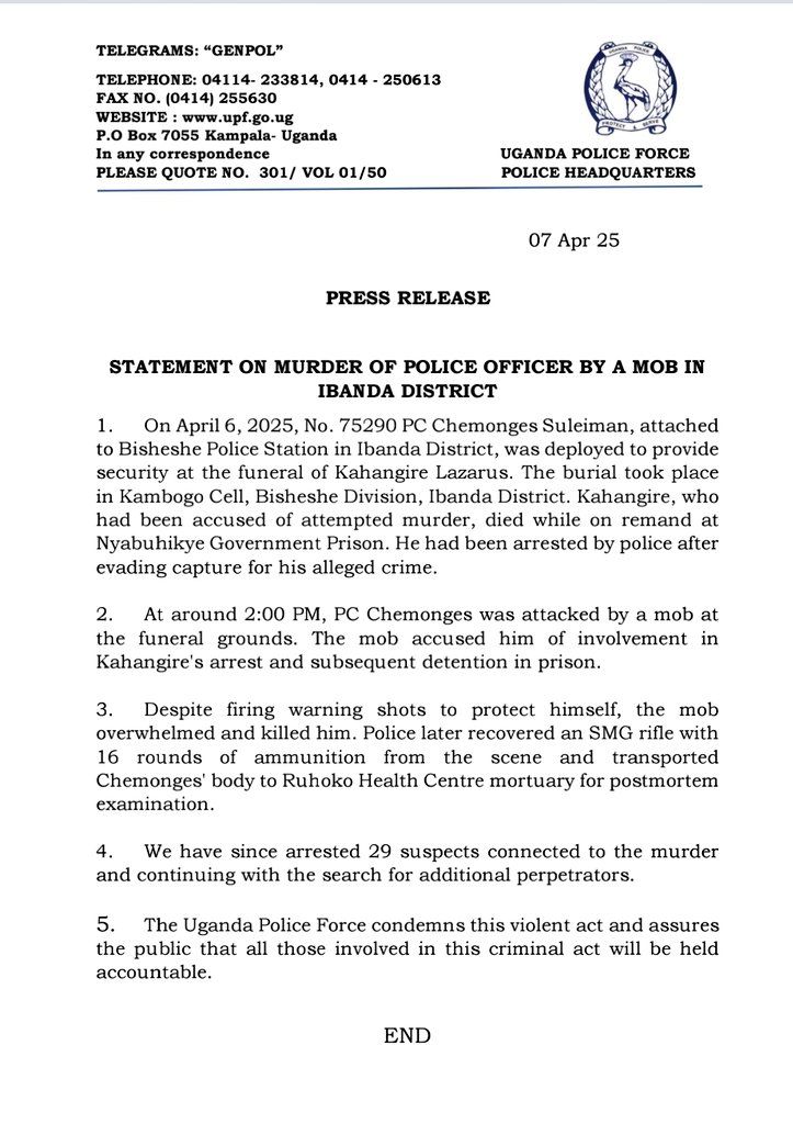 Ibanda, Uganda — Tragedy struck on April 6, 2025, when a police officer was brutally killed by a mob during a burial ceremony in Ibanda District.