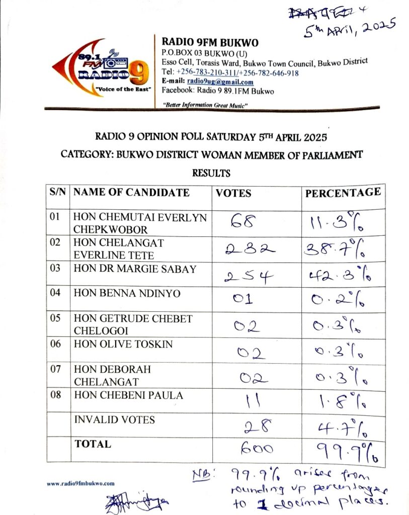 An opinion poll conducted by Radio 9FM Bukwo has put Dr Maggie Sabay in the lead with 42.3%.